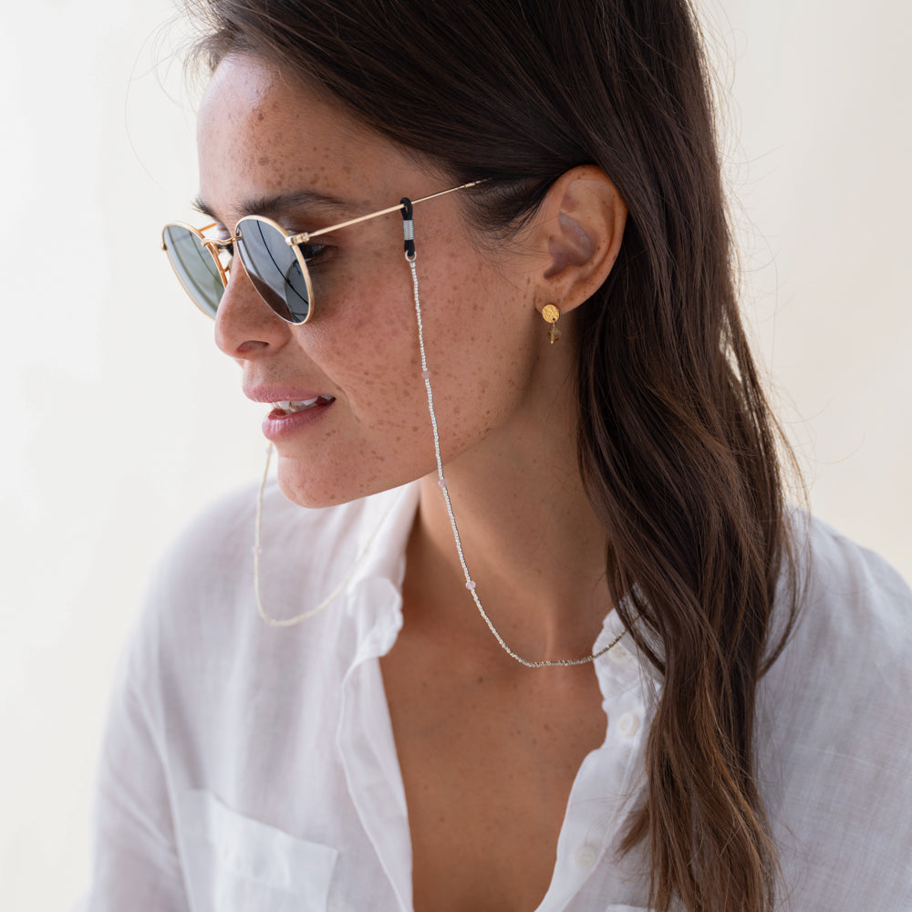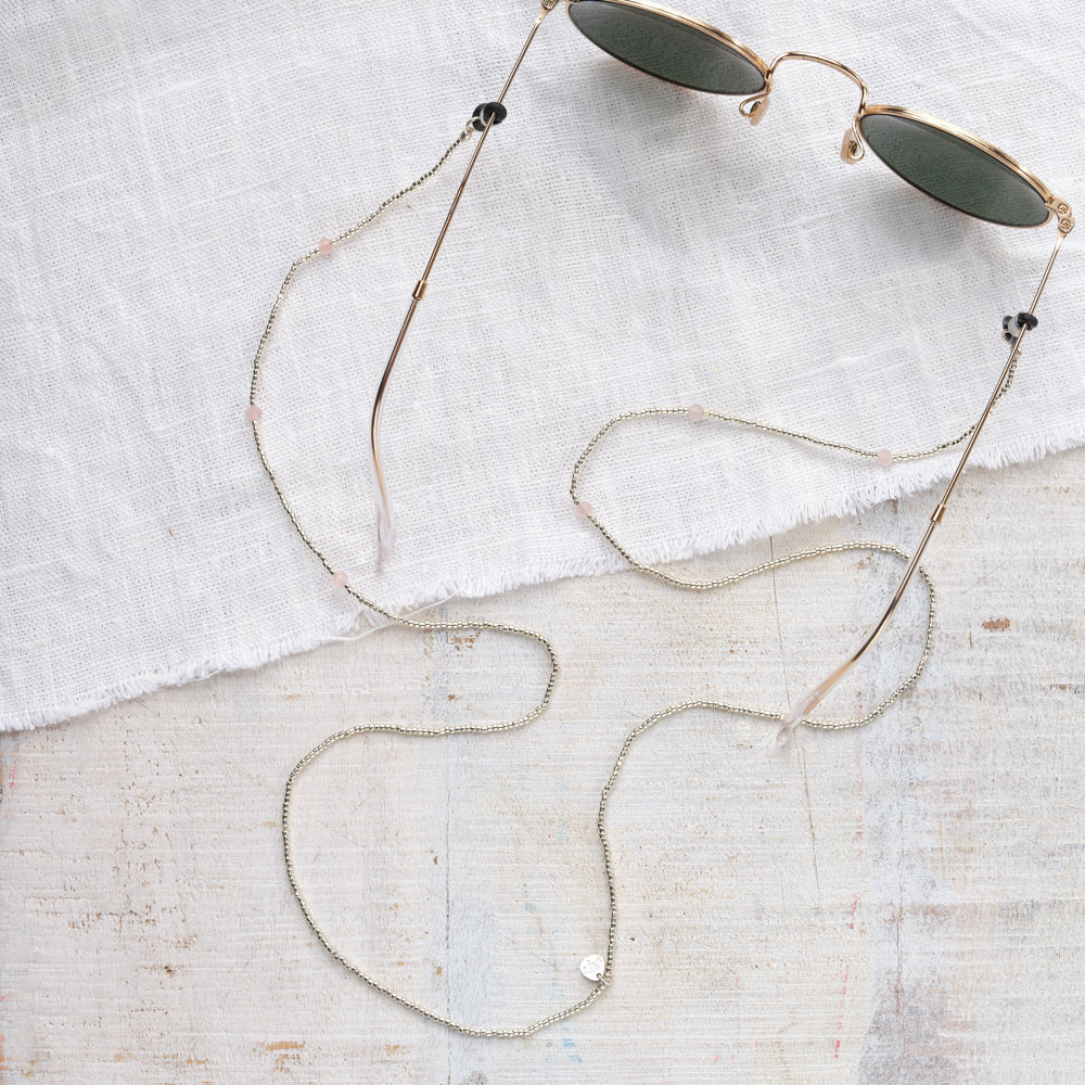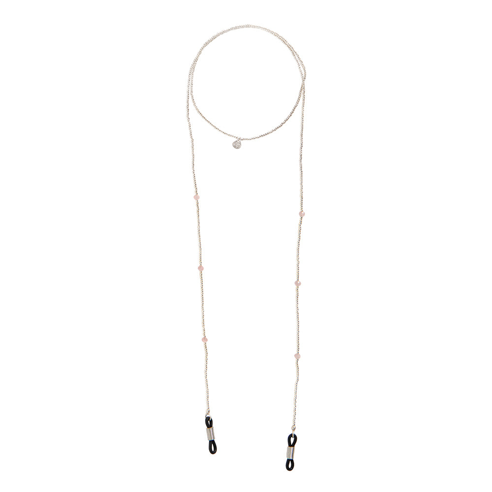 Ontdek het Shore Rozenkwarts Zilverkleurige Brillenkoord van A Beautiful Story. Dit handgemaakte brillenkoord combineert glaskralen met zes rozenkwarts maansteen edelstenen. De lengte is 74 centimeter en heeft rubberen uiteinden.