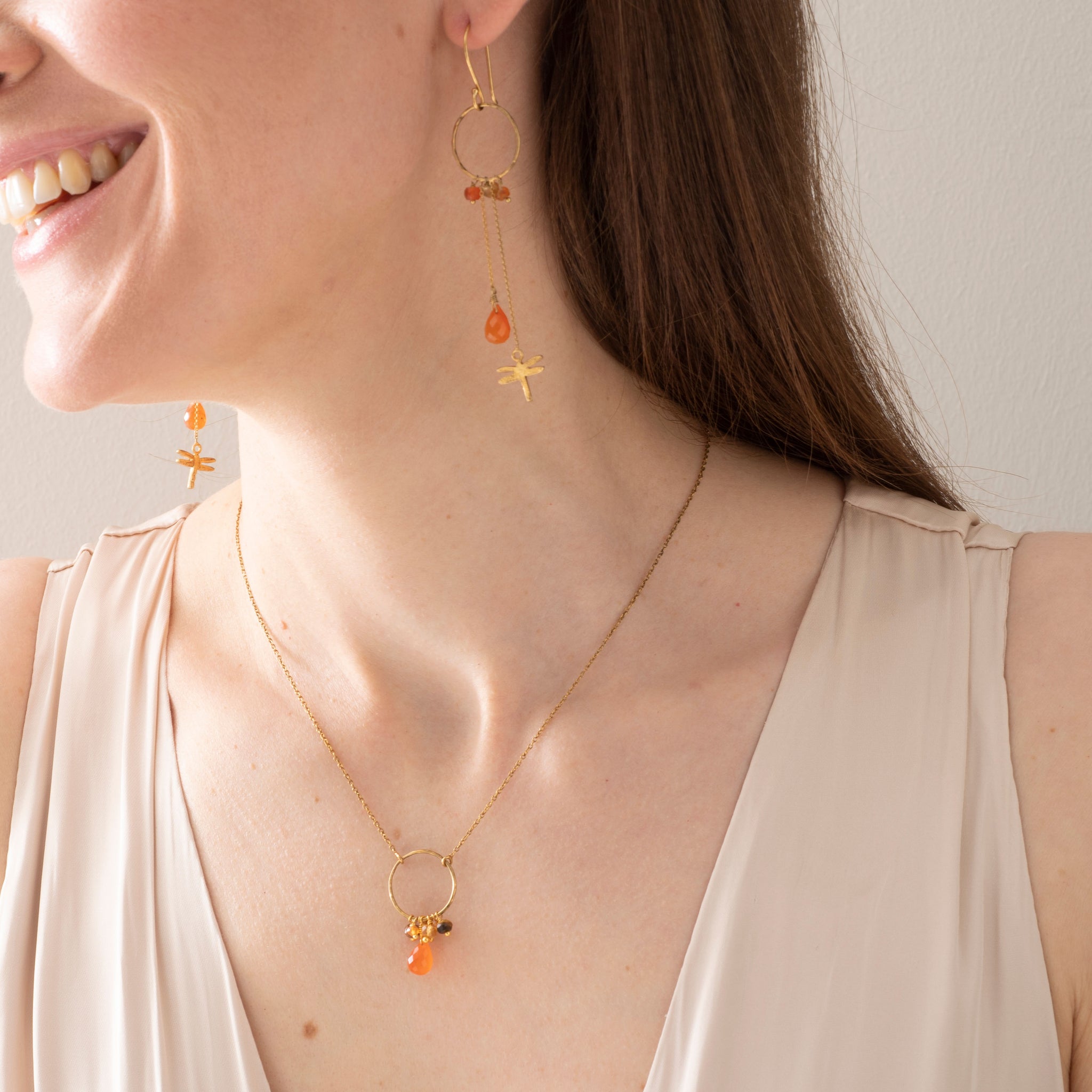 Deze vergulde koperen halsketting heeft een ring met geslepen edelstenen en een ovale carneoolsteen.