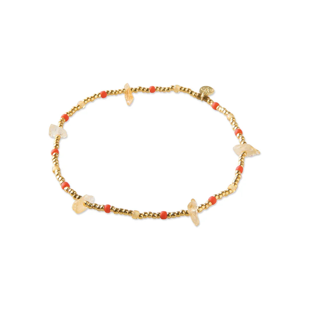 Het Thoughtful Citrien Goudkleurig Enkelbandje is handgemaakt met geel, oranje en goudkleurige glaskralen. De ruwe, kleine aventurijn edelstenen en gekleurde glaskralen zijn geregen op elastiek. Zo is het enkelbandje makkelijk te dragen. De energie van citrien is net een warme zomerdag. Met deze steen in de buurt heb je de zon altijd bij je. Wat een geluk.