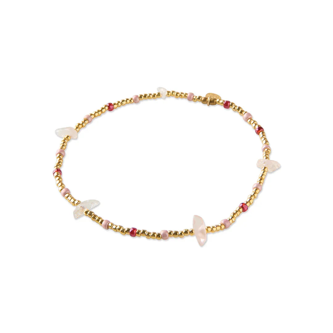 Het Thoughtful Rozenkwarts Goudkleurig Enkelbandje is handgemaakt met roze en goudkleurige glaskralen. De ruwe, kleine rozenkwarts edelstenen en gekleurde glaskralen zijn geregen op elastiek. Zo is het enkelbandje makkelijk te dragen. Rozenkwarts is de steen van de liefde. Zijn er problemen? Rozenkwarts lost ze op met zachtheid en compassie. Voor iedereen om je heen, maar vooral voor jezelf.