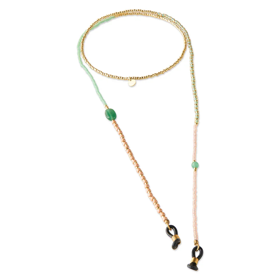 Het Unified Aventurijn Goudkleurige Brillenkoord is handgemaakt met 2 aventurijn edelstenen en glaskralen in perzik, groen en goudkleur. Met een lengte van 74 centimeter en rubberen uiteinden blijft je bril stevig op zijn plek. Ga op avontuur met een onbezorgd hart en maak de reis van je leven. Met aventurijn ga je helemaal je eigen gang en trek je de wereld in. Je zet elke stap met plezier.
