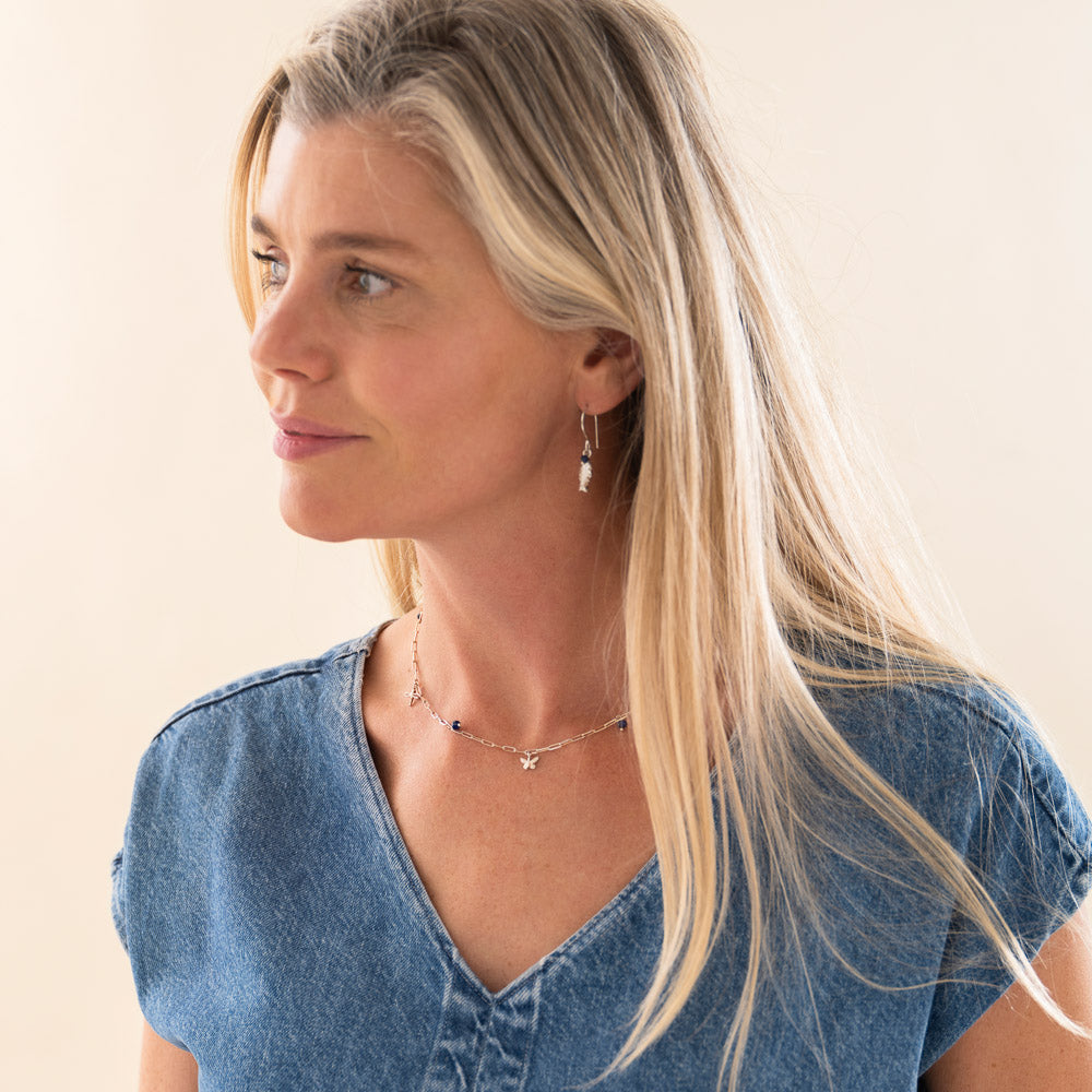 De United Lapis Lazuli Verzilverde Ketting van A Beautiful Story heeft een kleine verzilverde libelle en vlinder symbool bedel en 3 kleine lapis lazuli edelstenen. De ketting heeft een verstelbare lengte van 40 - 43 centimeter en sluit met een verzilverde sluiting. Lapis lazuli verbindt je vanuit je hart. De libelle is je gids in tijden van verandering en de vlinder staat voor transformatie, creativiteit en groei.
