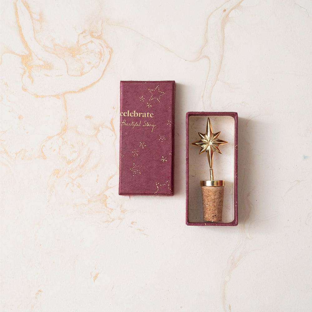 This Bottle Stopper North Star is made of recycled brass. The lower part is made of cork. The bottle stopper comes in a handmade festive gift box.
