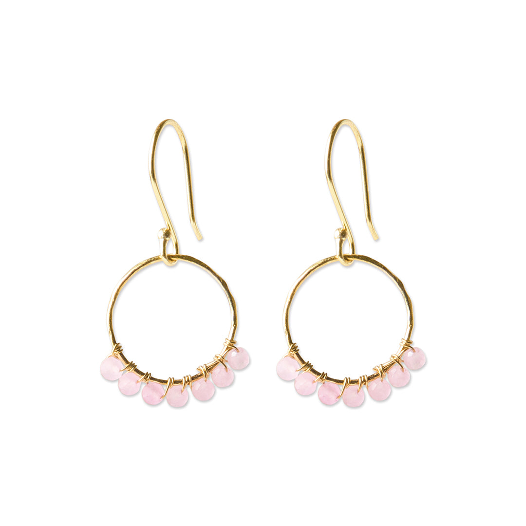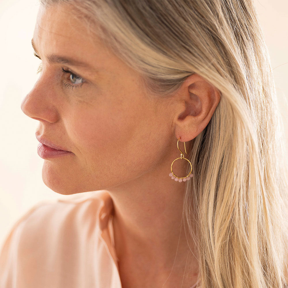 Meet the Compassion Rose Quartz Earrings Gold Plated. These earrings are handmade with gold-plated brass with small rose quartz gemstones. The earrings have a length of 3,5 centimeters. Rose quartz is the gemstone that governs all matters of the heart. Love, compassion and kindness are her remedies. We give it to everyone around us, but most importantly to ourselves because the revolution of true love starts within our own hearts.