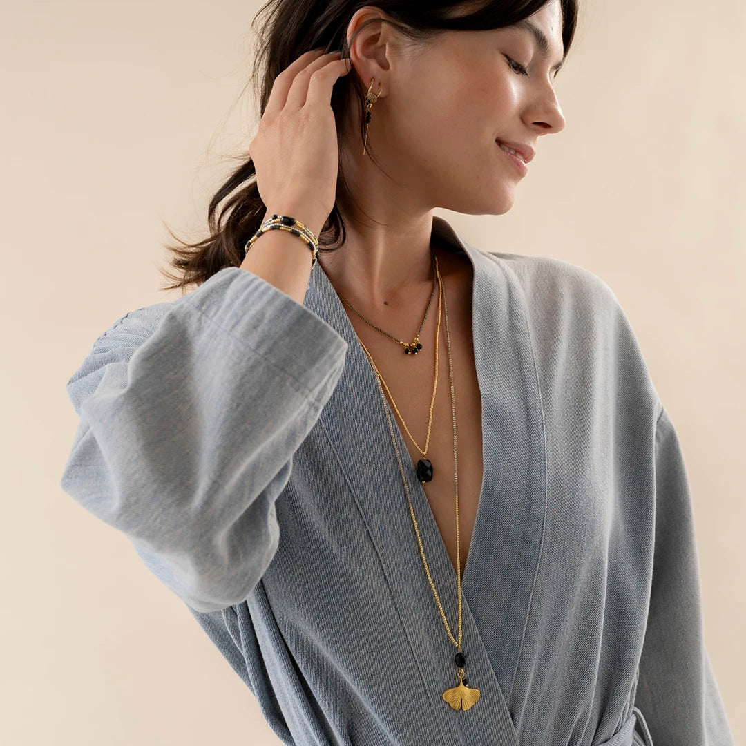 Discover the Empathy Black Onyx gold-colored Necklace. This refined necklace is crafted with gold-colored glass beads and features 3 small Black Onyx gemstones. Finished with a gold-plated clasp, this necklace is perfect for combining with other jewelry from the A Beautiful Story collection for an elegant and stylish look.The gemstone jewelry from A Beautiful Story is always here to support you on your journey.