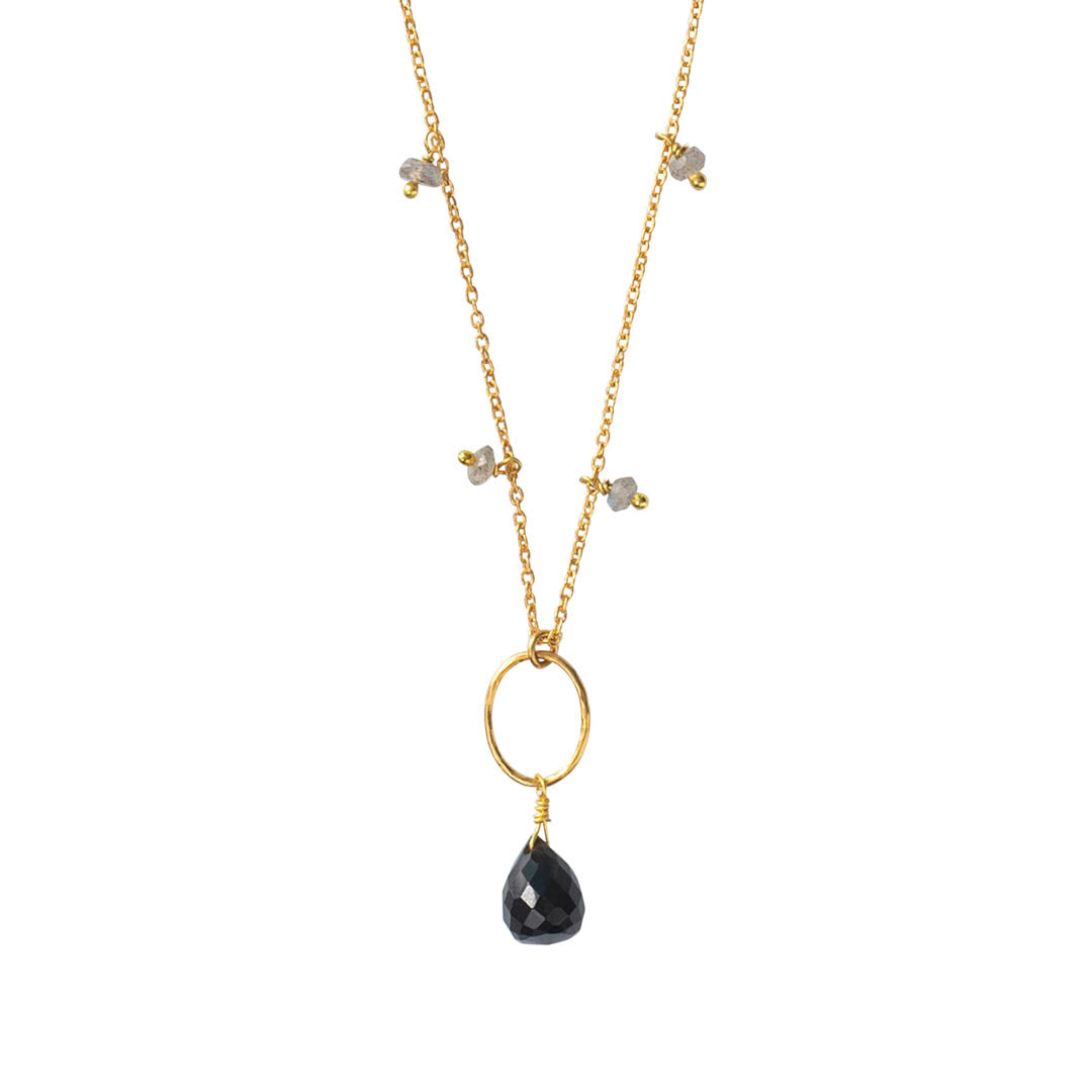 This Heaven Labradorite Black Onyx Gold Necklace of A Beautiful Story is gold-colored and made of gold-plated brass. The necklace features an oval ring, six faceted labradorite gemstones and a large black onyx gemstone. The length of the necklace is 42-45 centimeters.