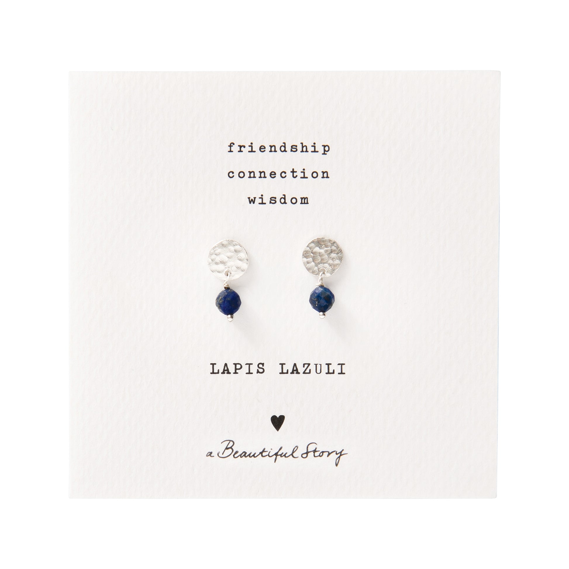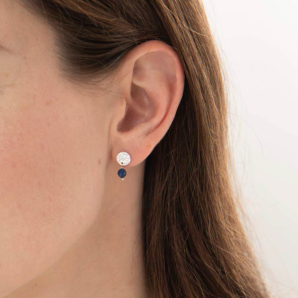 These Mini Coin Lapis Lazuli Silver Plated Earrings by A Beautiful Story are small stud earrings with a length of 1.5 centimeters. The handmade studs feature a silver-colored coin and a small lapis lazuli gemstone.