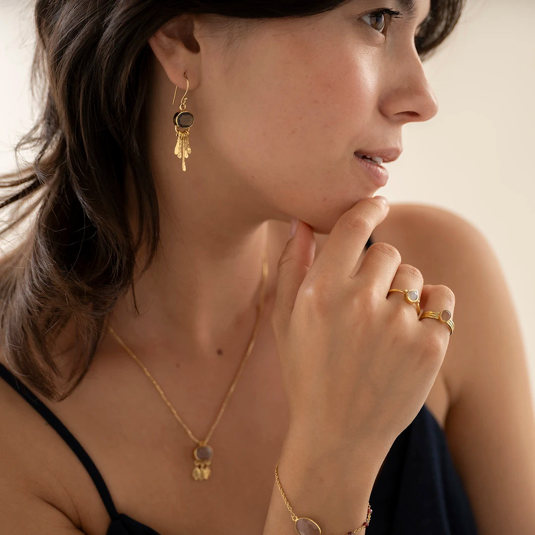 Looking for sophisticated earrings? The Praising Labradorite Earrings from A Beautiful Story's Timeless Treasures collection are perfect. These 22-carat gold-plated earrings feature a faceted oval Labradorite gemstone. Handcrafted in Jaipur, India, these earrings are more than just accessories—they're lucky tools that guide you on your journey.