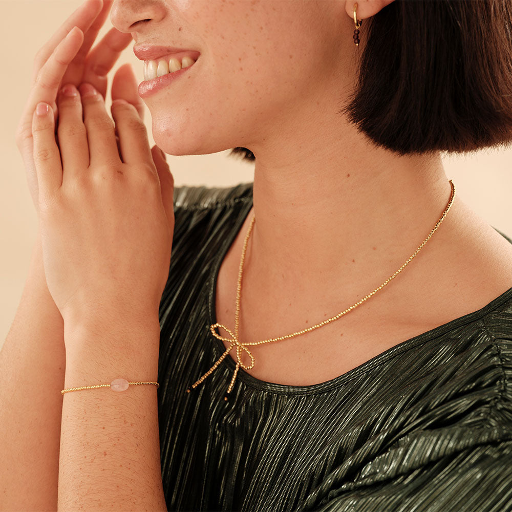 When festive cheer reaches its peak, sophistication makes a subtle statement. The wow factor of the Secret Rose Quartz Bracelet lies in the combination of chic gold-tone glass beads and faceted rose quartz - the gemstone of love.