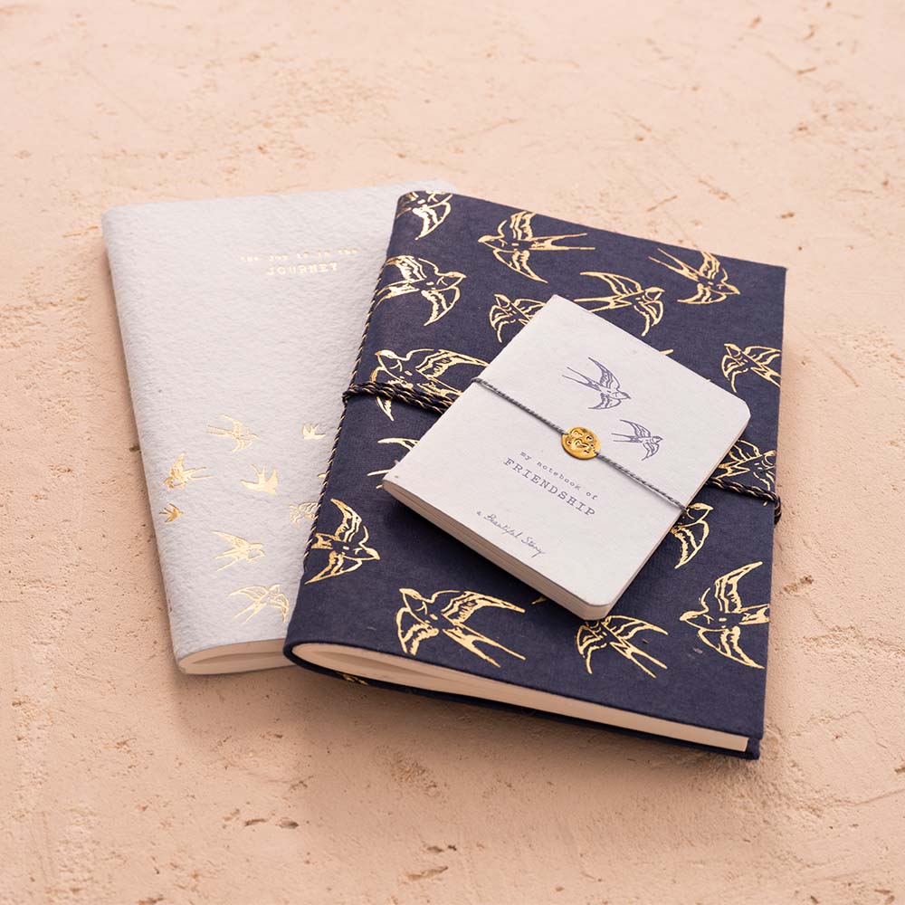 Discover the Sketchbook Swallows of A Beautiful Story. The book has 96 pages and measures 140 mm x 210 mm (A5). It's perfect for drawing and sketching. The cover of the book is made of katran plain recycled cotton paper and is decorated with gold swallows. The sketchbook closes with a cotton wrapping cord.