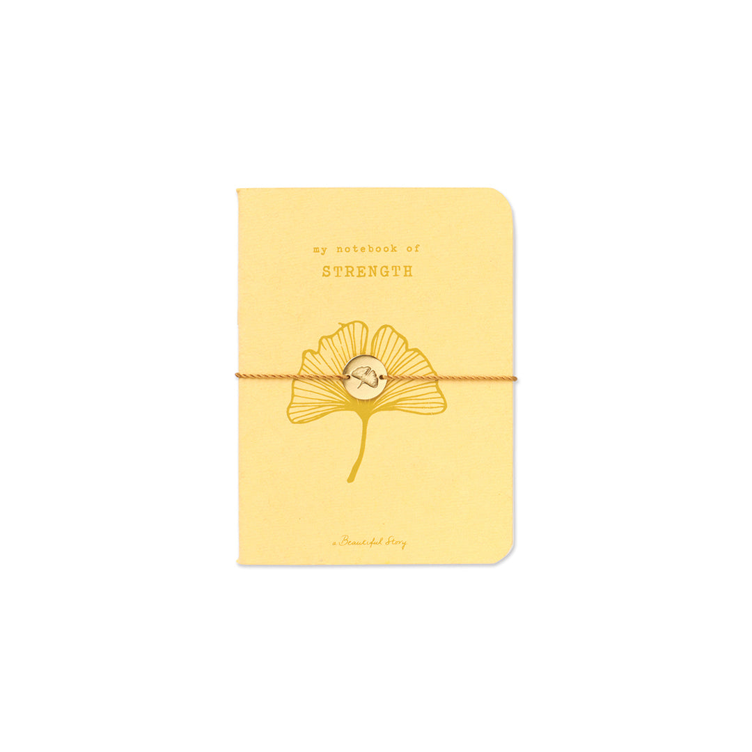 The Storybook Ginkgo is a mini 72-page notebook with a bracelet featuring a brass coin with a Gingko leaf symbol. The bracelet has a sliding knot made of cotton thread. The storybook says “My notebook of strength” and measures 8 cm x 11 cm (A7 size). The covers of all our notebooks are made of recycled material. They are made from leftovers from the clothing industry.